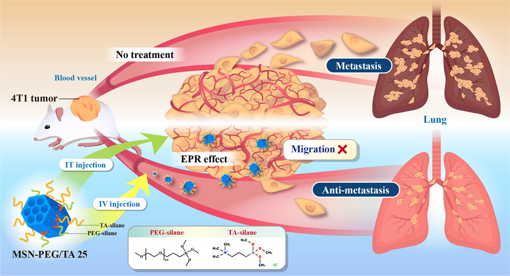 Despite advancements in nanomedicine for drug delivery, many drug-loaded nanoparticles reduce tumor sizes but often fail to prevent metastasis. Mesoporous silica nanoparticles (MSNs) have attracted attention as promising nanocarriers. Here, we demonstrated that MSN-PEG/TA 25, with proper surface modifications, exhibited unique antimetastatic properties. In vivo studies showed that overall tumor metastasis decreased in 4T1 xenografts mice treated with MSN-PEG/TA 25 with a notable reduction in lung tumor metastasis. In vitro assays, including wound-healing, Boyden chamber, tube-formation, and real-time cell analyses, showed that MSN-PEG/TA 25 could modulate cell migration of 4T1 breast cancer cells and interrupt tube formation by human umbilical vein endothelial cells (HUVECs), key factors in suppressing cancer metastasis. The synergistic effect of MSN-PEG/TA 25 combined with liposomal-encapsulated doxorubicin (Lipo-Dox) significantly boosted mouse survival rates, outperforming Lipo-Dox monotherapy. We attributed the improved survival to the antimetastatic capabilities of MSN-PEG/TA 25. Moreover, Dox-loaded MSN-PEG/TA 25 suppressed primary tumors while retaining the antimetastatic effect, thereby enhancing therapeutic outcomes and overall survival. Western blot and qPCR analyses revealed that MSN-PEG/TA 25 interfered with the phosphorylation of ERK, FAK, and paxillin, thus impacting focal adhesion turnover and inhibiting cell motility. Our findings suggest that drug-free MSN-PEG/TA 25 is highly efficient for cancer treatment via suppressing metastatic activity and angiogenesis.